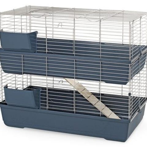 Dobbelt kaninbur hvor kaninen kan gå op og ned af trappen i buret. Trappen kan lukkes af når kaninerne skal blive i hver sit rum.