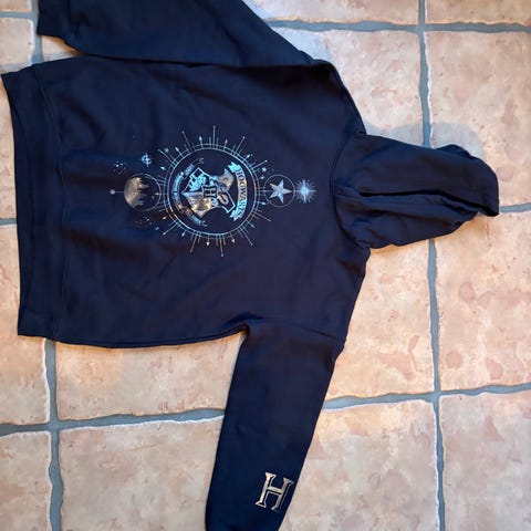 H&M Harry Potter / Hedwig T-shirt i blå farve, størrelse 146/ 152 til piger. Fremstillet i bomuld. T-shirten har et motiv af Hedwig, uglen fra Harry Potter, og en knude-detalje foran.
