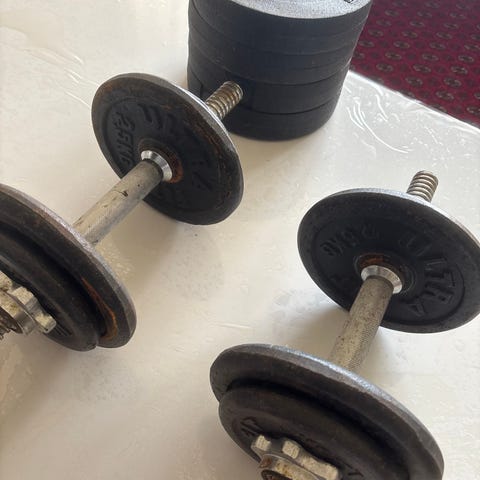 Justerbare håndvægte sæt i sort metal med flere vægtskiver. Håndvægtene kan tilpasses i vægt efter behov ved at tilføje eller fjerne skiver. Velegnet til styrketræning og fitnessøvelser. På hver vægt er 6x2,5 kg, 2x1,25 kg samt stang af ca. 1,5 kg - i alt op til 19 kg pr håndvægt.