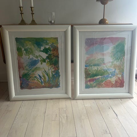 Vægdekoration bestående af flere kunsttryk i forskellige størrelser og motiver. Indeholder portrætter, landskabsbilleder og abstrakte værker, alle indrammet. Velegnet til ophængning i stue eller galleri.