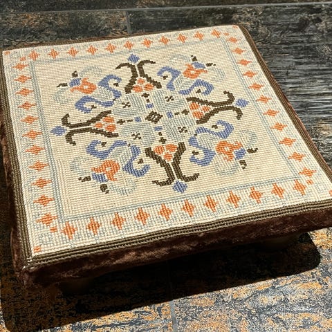 Lille lav vintage fodskammel med korsstingsbroderet stof. Har masser af patina med orm og revne i en træfod, revnen er fast, altså den har været der længe uden den har udviklet sig.