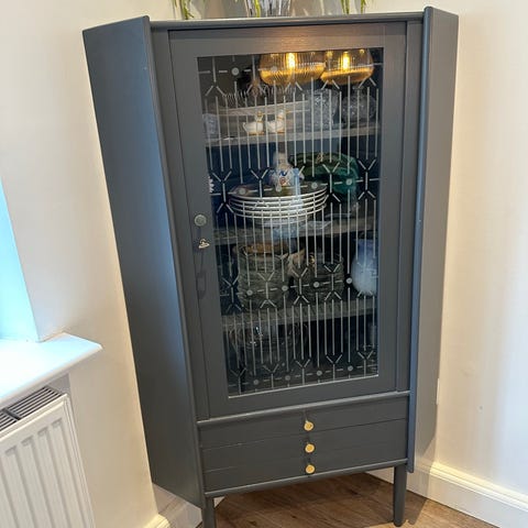 Ældre vitrineskab med glas foroven og låge forneden - påbegyndt restaurering.