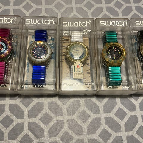 Swatch herreur med forskellige remme og urskiver. Urene har både læder- og gummirem i forskellige farver. Designet er varieret med både lys og mørk urskive. Velegnet til daglig brug.Alle urene er i ubrugte stand-ingen tegn på slidt.Laveres med nye skiftende batterier.
