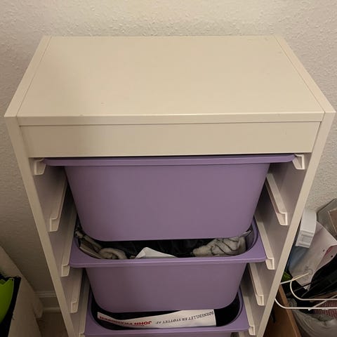 IKEA børnemøbler med opbevaringsbokse i lilla. Sættet består af flere moduler i hvidt materiale, designet til børneværelset med praktiske opbevaringsløsninger.