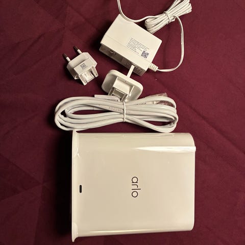 Netgear Arlo overvågningskamera sæt i hvid. Sættet består af 5 trådløse kameraer med tilhørende magnetiske vægbeslag, som ses på billederne. Kameraerne er beregnet til videoovervågning inde eller ude afhængigt af model og opsætning. Enheden i baggrunden fungerer som base station til tilslutning af kameraerne til netværk. Sættet egner sig til overvågning af bolig, kontor eller andre områder, hvor der ønskes kameraovervågning.