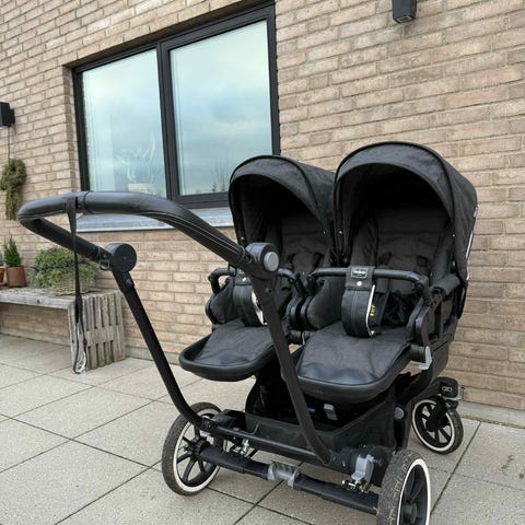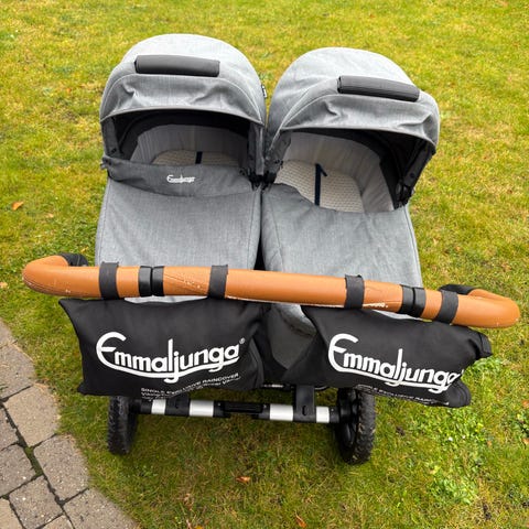 Emmaljunga søskendevogn i mørkegrå. En lift og to klapvognssæder medfølger. Originalt regnslag til den ene klapvogn medfølger.