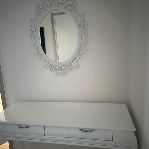 Flot hvidt konsolbord med spejlfinish og kromben samt rundt dekorativt spejl. Perfekt til entré eller stue. Meget pæn stand.