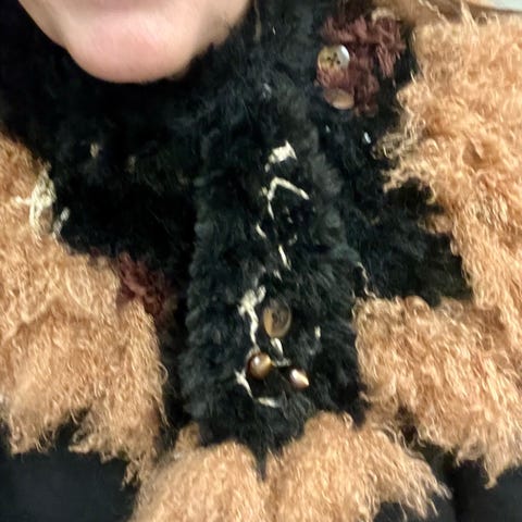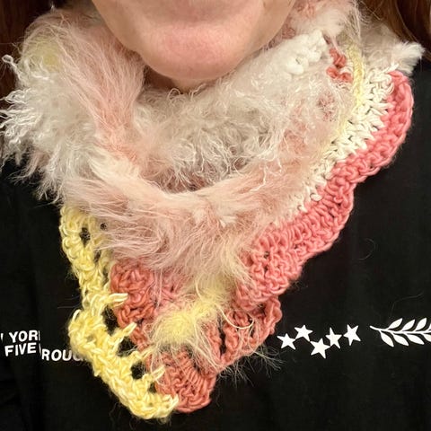Hjemmehæklet farverigt tørklæde.