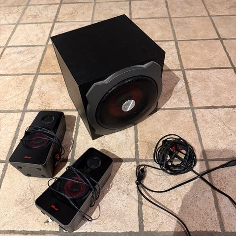 Subwoofer med forstærker og 5 surround-højttalere med fjernbetjening og alle nødvendige ledninger.Hvis du vil have god lyd fra mobil, smart-phone, pc, cd eller lignende, er her et god bud.