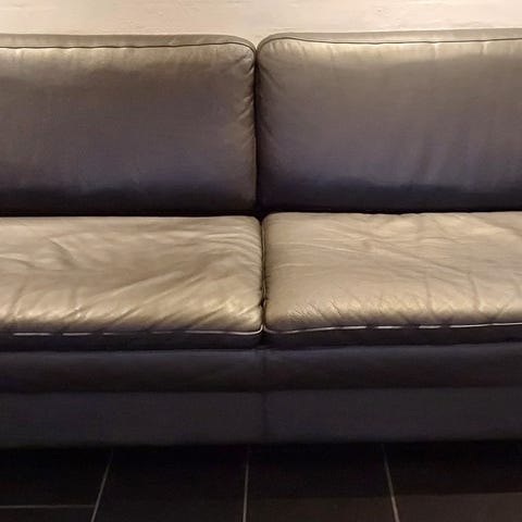 Lækker sofagruppe i cognacfarvet læder med bøgestel.