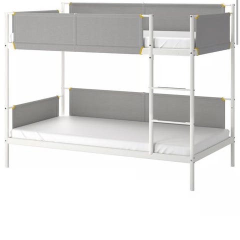 IKEA Køjeseng til børn i hvid metal. Designet som en pladsbesparende løsning med to senge i et kompakt format. Velegnet til børneværelser med behov for ekstra sovepladser