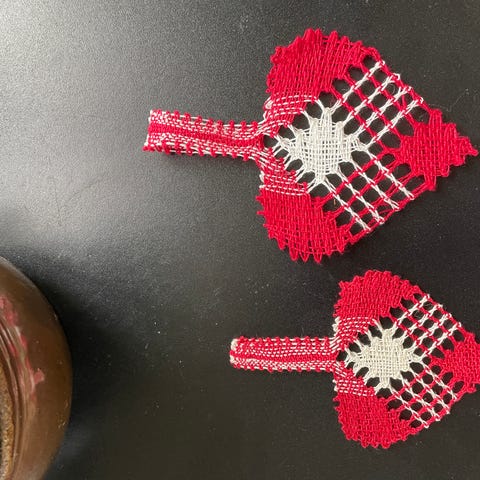 3 stk. flotte røde kræmmerhuse med hank syet i rødt stof med patchwork på siden. str. 22 cm.'