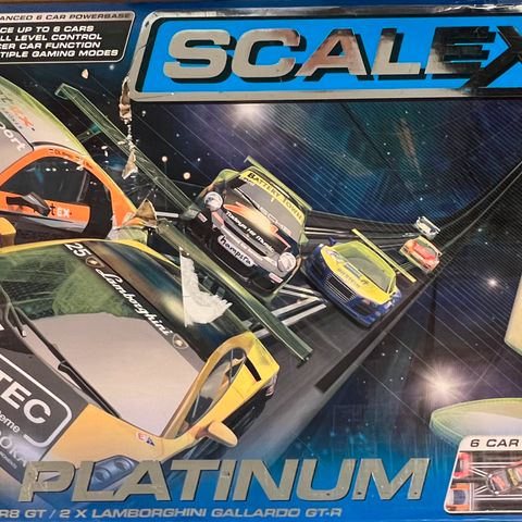 Scalextric Pro Platinum GT. Den store digital bane med ekstra mange skinner. Ca 17 meter i alt (standard 9 meter). Digitale skiftespor med mulighed for at til 6 biler på banen på samme tidspunkt. Bilerne har mindre skader (knækket sidespejle og Down Force vinge) men alt kører som det skal. Mulighed for via app at gøre race med pitstop, dækskifte og meget mere. Timevis af underholdning for store og små. Nypris fra 5.000 for standardbanen. Hertil er det købt ekstra skinner som også indgår.