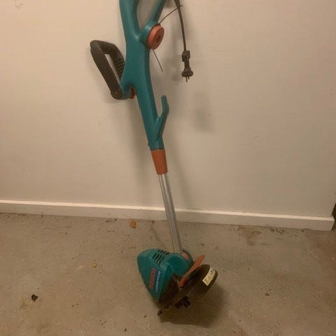 Bosch elektrisk græstrimmer med ledning, designet til trimning af græs og kanter i haven. Udstyret med et håndtag og justerbar skaftlængde for komfortabel brug.