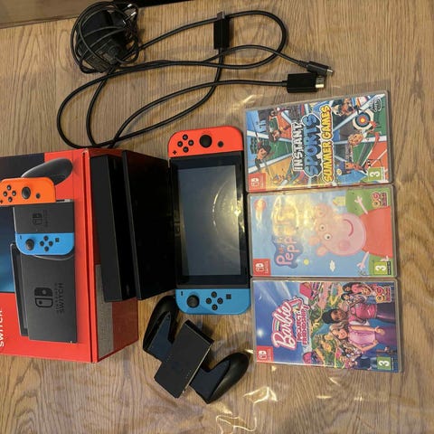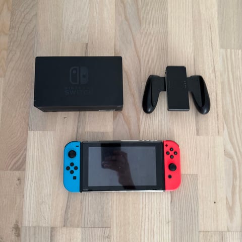 Nintendo Switch spilkonsol med to Joy-Con controllere i rød og blå. Inkluderer flere spil i kassetter samt en opbevaringsetui med Nintendo Switch logo. Konsollen er bærbar og designet til gaming på farten.