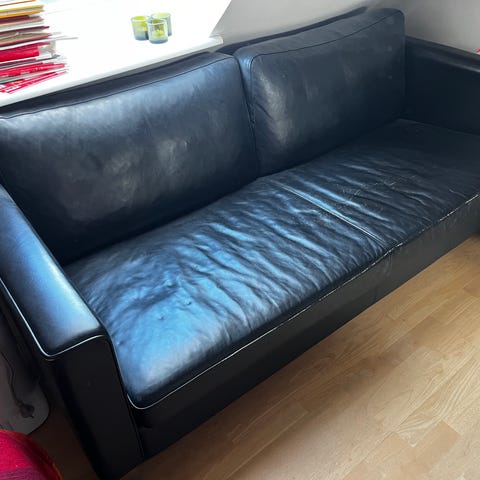 2½-personers sofa betrukket med patineret sort anilin læder, løse hynder samt pølle betrukket med sort patineret anilin læder, kvadratiske ben af stål.