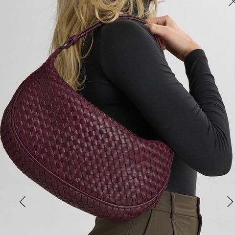 Markberg skuldertaske til kvinde i læder med flettet design. Tasken har en justerbar skulderrem og lynlås som lukning. Indvendigt foret med stof og indeholder en lynlåslomme. Velegnet til daglig brug.