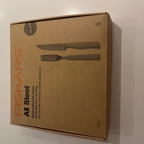 Fiskars All Steel bestik sæt med 24 dele, designet til steak og daglig brug. Sættet indeholder knive og gafler i rustfrit stål. Helt nyt og aldrig brugt