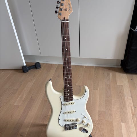 Olympic white med rosewood fretboard i MEGET flot stand. Den har ingen brugsspor og har egentlig bare samlet støv ved siden af en Gibson i et par års tid. Jeg har set mig varm på en Suhr-guitar, så denne må forlade sin plads i stativet. Jeg har sat locking tuners på den, men skifter dem naturligvis gerne ud med de originale/lægger dem med i casen (som naturligvis medfølger)