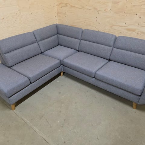 Hjørnesofa med mørkeblåt betræk. Sæderne er i koldskum med springindlæg, og ryggen er i ren koldskum, hvilket er med til at give en fast følelse, når man sidder i sofaen. Puf med obevaring kan købes seperat eller samlet. Nypris på puf 899