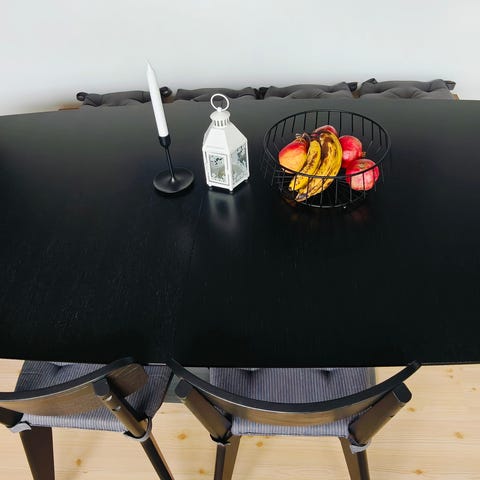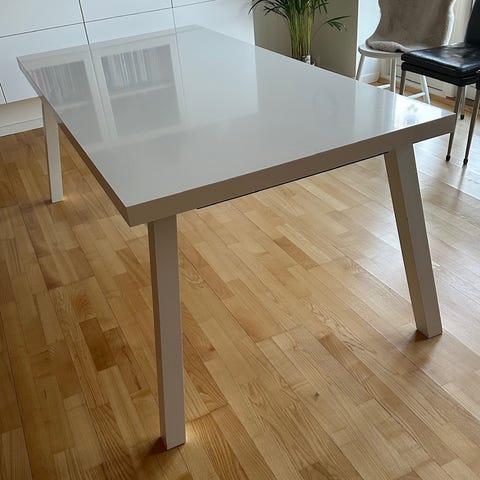 Lækkert spisebord med indbygget udtræk. Lidt ridser og hakker i bordpladen, men pænt.