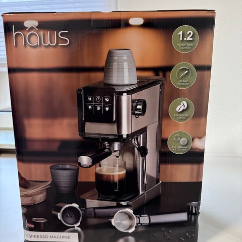 Håws espressomaskine med tilbehør, herunder to portafilter, tamper, og ekstra dele. Maskinen har et rustfrit ståldesign og er beregnet til at lave espresso. Inkluderer brugervejledning.