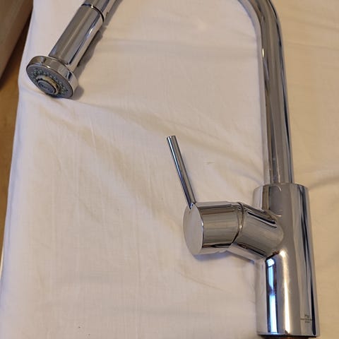 Har boet i huset i 4 mdr og har skiftet til Quooker. Derfor er dette næsten nye Hansgrohe Talis M54 køkkenarmatur med udtræktud og med 1-grebs betjening til salg. Er fremstillet i messing.