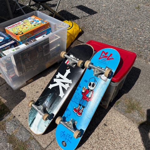 Blueprint Skateboard med blå og hvid farve. Skateboardet har hjul og trucks monteret, egnet til skateboarding aktiviteter.