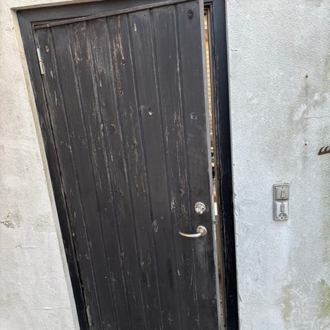 Sort trædør og tilhørende sort trævinduer. Døren har to låse og vinduet er stort med skydefunktion. Begge er i sommerhus som skal rives ned og passer til bygninger med træfacade.