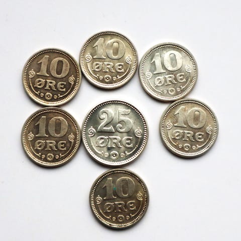 Sverige 153 stk forskellige 1 øre til 10 kr 1875 og frem. Bla 47 stk sølv 25 øre med aktuel sølvværdi på ca. 850 kr.