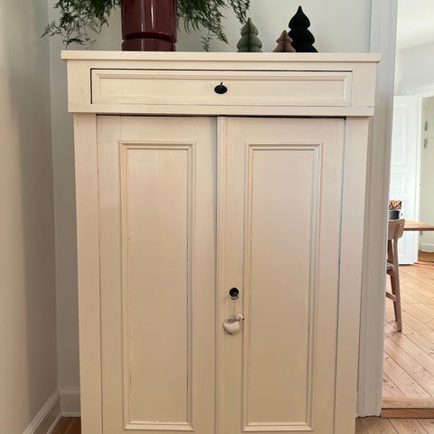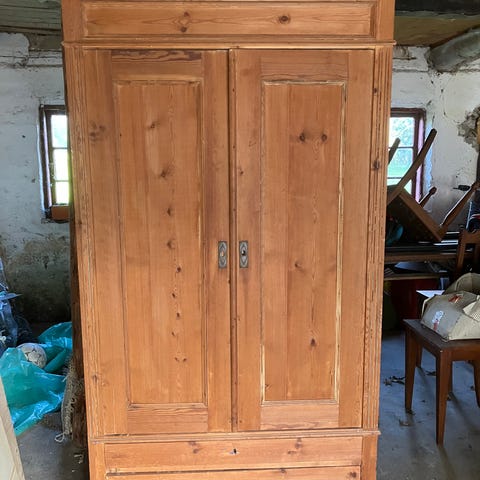 Rå og flot karlekammer skab på hjul så det nemt kan flyttes rundt med. Kan låses foran. Højde 160 cm. Bredde 83 cm. Dybde 37 cm.