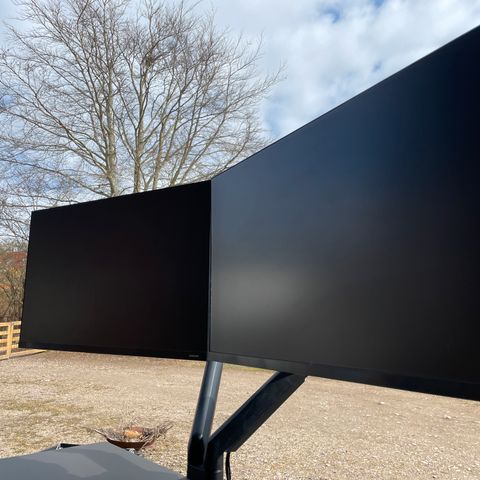 Jeg har et nyt job og har ikke brug for mit hjemmekontor udstyr. Så jeg vil gerne sælge 2 stk. full hd 27“ skærme med en beslag til begge skærme.