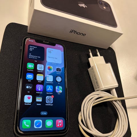 Apple iPhone 11 med 64 GB lagerplads. Fungere 100% og meget velholdt. Der følger også passende sort cover med jvf billederne.
