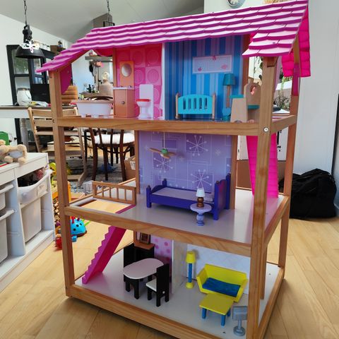 dukkehus med flere etager, detaljerede værelser. Dukkehuset har trapper og forskellige ruminddelinger, designet i farver som pink og blå. Egnet til leg med Barbie-dukker. Byd gerne skal bare af med den.