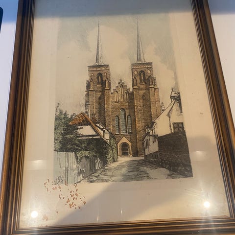 Signeret grafisk tryk med motiv af en gade med brostensbelægning og bindingsværkshuse. Trykket er udført i sort-hvid og indrammet i en sort ramme. Motivet viser et gammelt bymiljø med træer og bygninger med synlige vinduer og skodder.