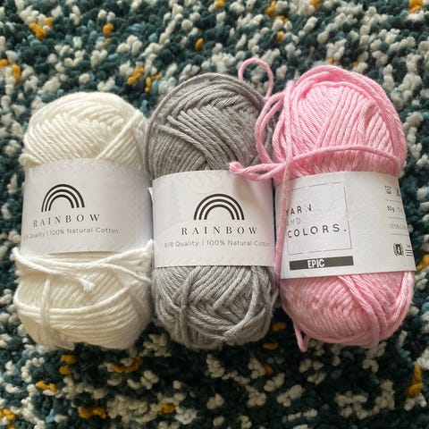 8 garnnøgler i bomuld fra Hobbii i farven 04 (beige).