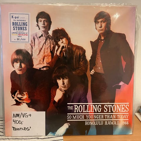 The Rolling Stones vinylplader med forskellige albumcovers, herunder 'Their Satanic Majesties Request', 'Aftermath', 'Flowers', og flere. Vinylpladerne har varierende coverdesign og er til samling eller afspilning.