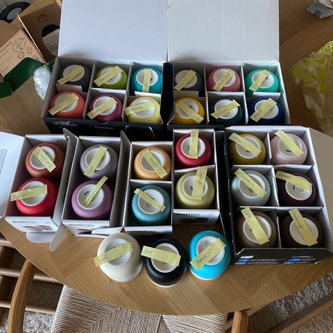 6 hvid riflet Royal Copenhagen Kontrast krus i blå og grønne farver.