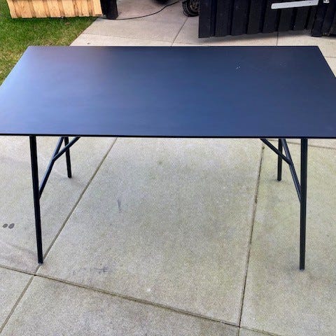 Praktisk og stilrent skrivebord i lyst trælook med sort metalstel. Bordet er stabilt, pladsbesparende og passer perfekt til hjemmekontor, studie eller som ekstra arbejdsbord. Fremstår i pæn stand og klar til brug.