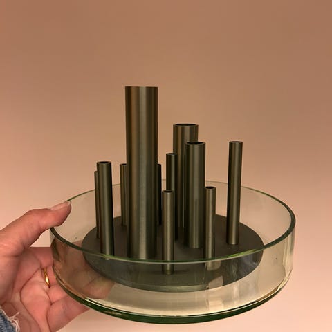 Fritz Hansen blomstervase fremstillet i klart glas med låg i messing. Låget har flere huller og er designet til at holde blomster på plads. Vase og låg kombinerer materialer glas og messing.