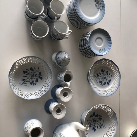 Komplet spisestel til 12 personer, forret/dessert tallerkner, dybe, flade, 3 fade, terrin, sovseskål, skål