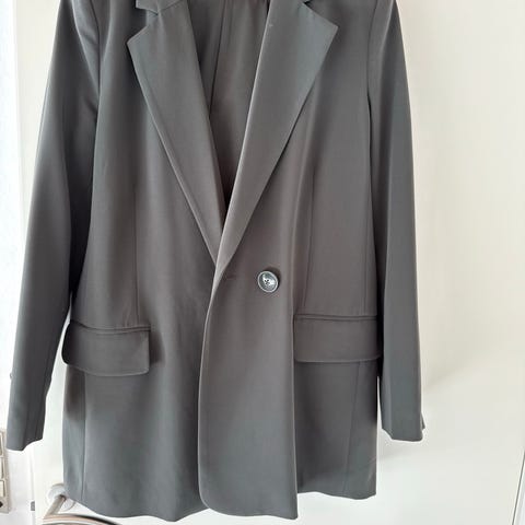 InWear blazer og bukser sæt i størrelse 40/42 til kvinder. Farven er grå, og materialet er polyester. Sættet består af en blazer med knapper og matchende bukser.
