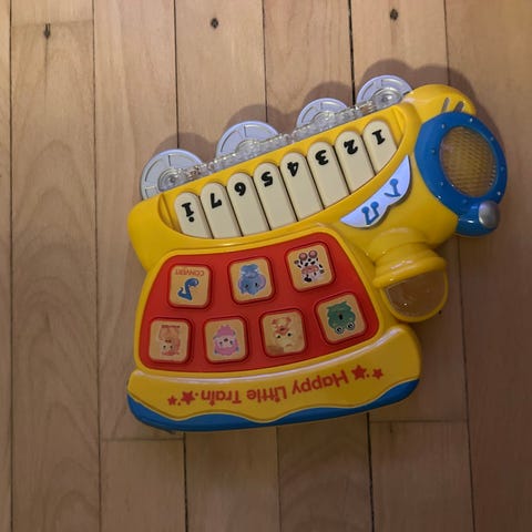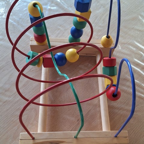 Har forskellige farverige perler og former, der kan flyttes langs snoede metaltråde.