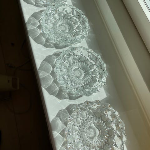 dekoration ornamenter i glas. Sættet indeholder tre forskellige skåle i forskellige former og farver, herunder blå og grønne nuancer. Produkterne er velegnede til brug som dekorative elementer i hjemmet.Sælges samlet
