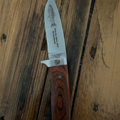 Helle Kniv/Fiskekniv/Jagtkniv/SnitteknivSpejderkniv,i original læderskede,skæfte af træ med ben afslutning.