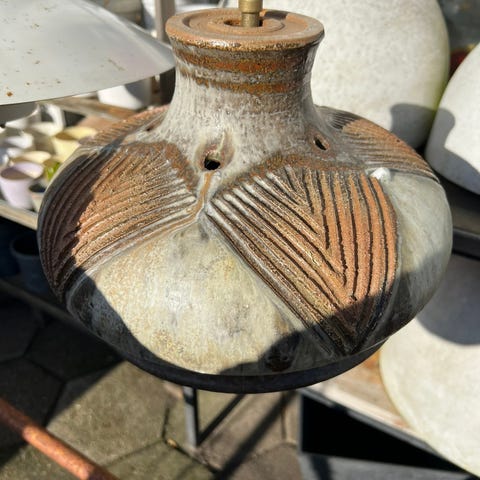 Flot loftlampe i keramik fra Axella, Jette hellerø, med dekorative detaljer og kædeophæng. Lampen har været i familiens eje i mange år og er passet godt på. Den fremstår i meget fin stand med normale brugsspor.