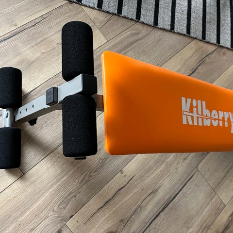 Kilberry træningsbænk med orange polstret ryglæn og metalramme. Udstyret med skumruller til benstøtte. Velegnet til forskellige styrketræningsøvelser.