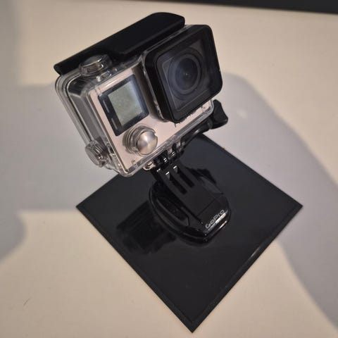 GoPro Hero4 Actionkamera med tilbehør inklusive batterier, oplader og vandtæt hus.