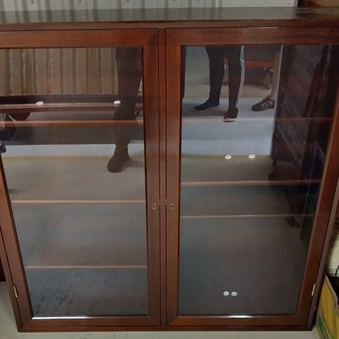 2 cabinets stacked, one for wine glasses with glass shelves and light inside
