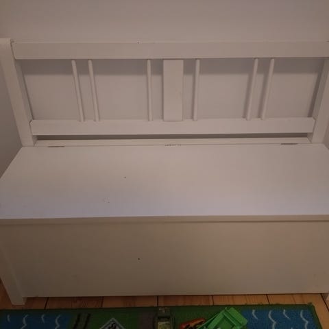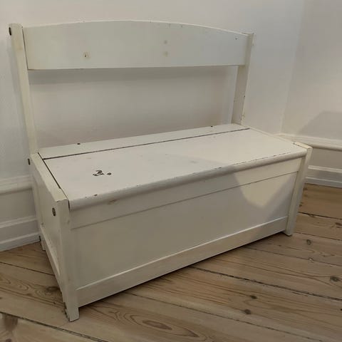 børnebænk i hvidt træ med opbevaringsrum